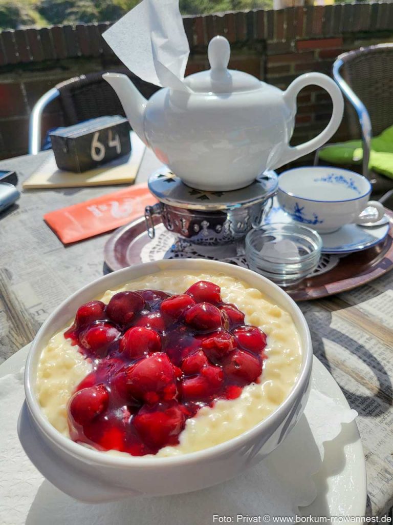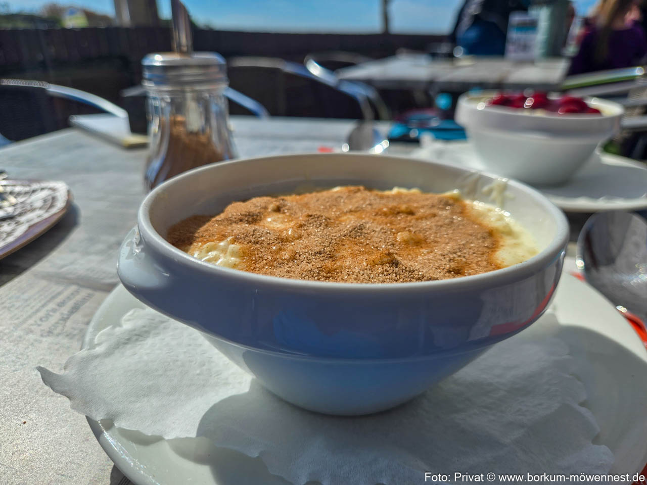 Um es vorweg zu nehmen: Unser Eindruck war am Ende sehr positiv. Das durchgängig schöne Wetter half bei diesem Eindruck natürlich. Aber den Vorteil hatten die Milchbuden ja bei Christians erstem Aufenthalt auf Borkum auch. Das freundliche Personal (auch wenn Stress ist) ist hier zuerst zu nennen. Nach wie vor holt man sich die Sachen selber an der Theke ab. Aber das Angebot ist deutlich größer und zum Teil auch internationaler. Keine Sorge: Milchreis und Quark gibt es bei den meisten Buden natürlich immer noch. Und auch ansonsten an vielen Stellen. Hier die Varianten mit Kirschen und die Variante mit Zimt und Zucker im Sturmeck… Von der Wohnung ein schöner Spaziergang von vielleicht 10 bis 15 Minuten – je nachdem wie flott man geht.